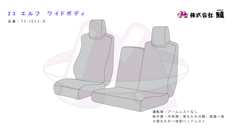運転席ひじ掛け無し、助手席・中席背もたれ部分分割、座面一体(ベンチシート)、枕一体式(背もたれ一体型ヘッドレスト)