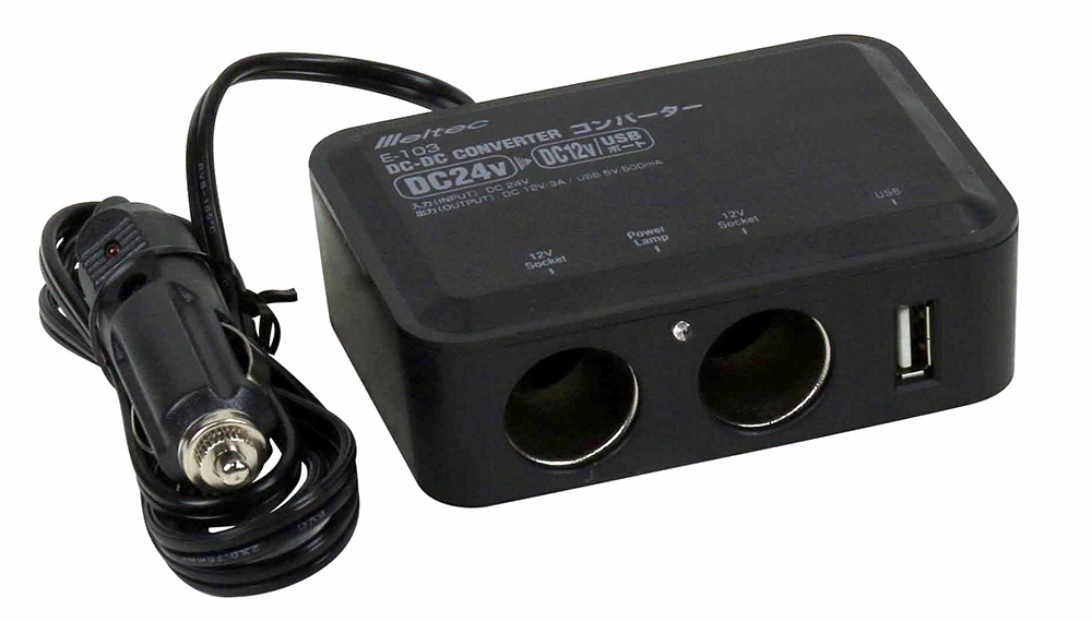 アクセサリーソケットに差し込むだけで、DC24VからUSB出力やDC12Vに変換できます。